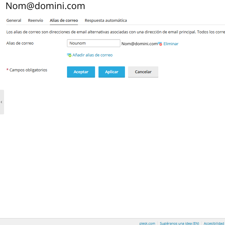 Configura amb el nom que vulguis (ex: NouNom@domini.com) per rebre correus a la teva bústia habitual.