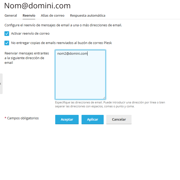 Activa la funció: Marca la casella Activar reenvío de correo.