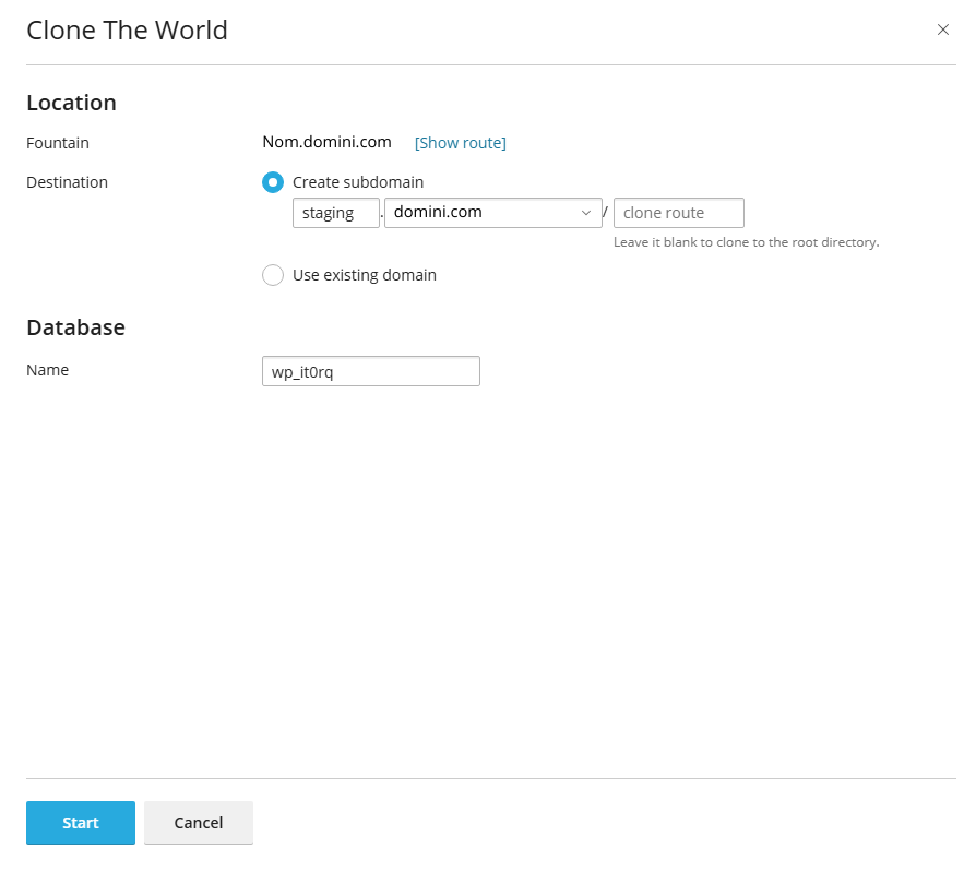 - Opció manual: Si ja tens un domini comprat o un subdomini creat, tria Utilitzar domini existent.