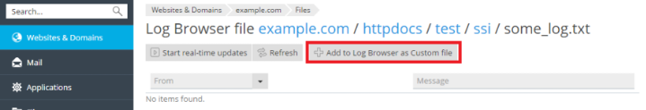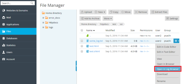 Des del Gestor de fitxers: També pots obrir qualsevol fitxer de text directament des del navegador de fitxers de Plesk triant l’opció Obre a l’explorador de registres.