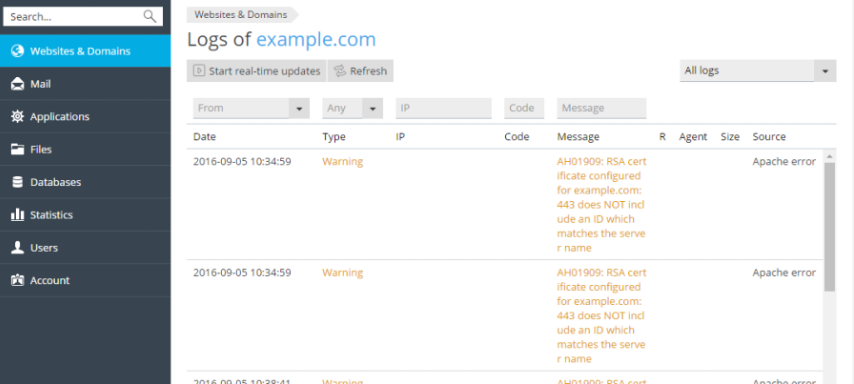 - Filtrar: Pots triar veure només els errors d’Apache, Nginx o IIS segons el que busquis.