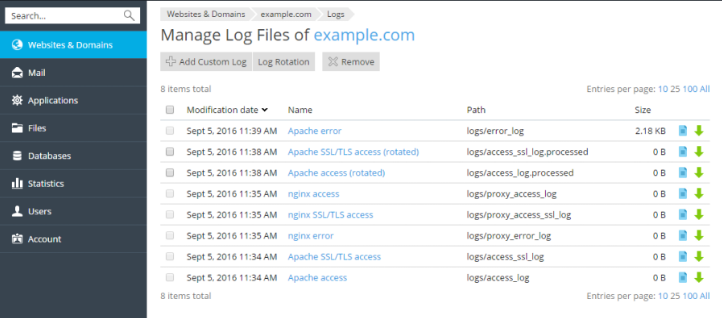 - Estalvia espai (Rotació): Dins de la mateixa pantalla, entra a Rotació de registres per configurar que Plesk comprimeixi o elimini automàticament els fitxers antics.