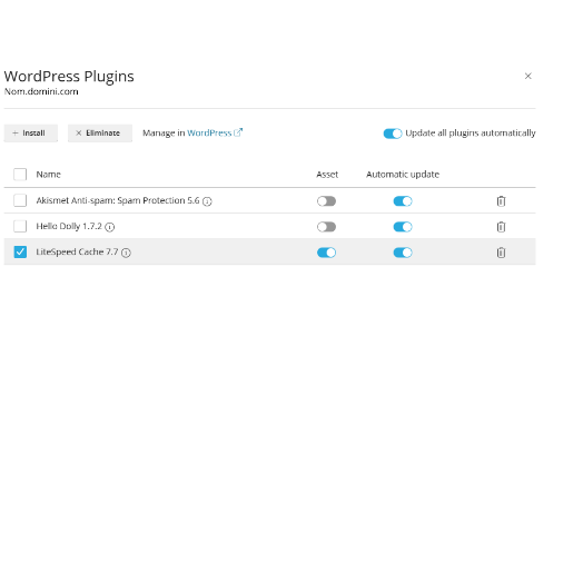 Si voleu suprimir un plugin, feu clic a la icona de paperera corresponent al plugin que voleu suprimir. Si voleu suprimir diversos plugins, seleccioneu-los i feu clic a Suprimeix.